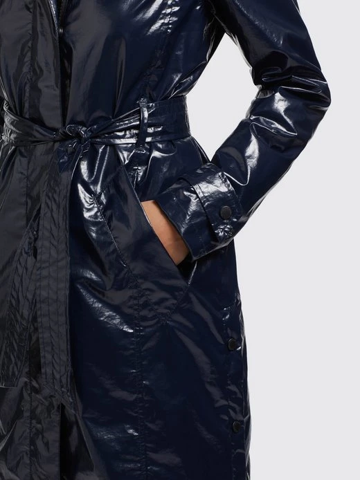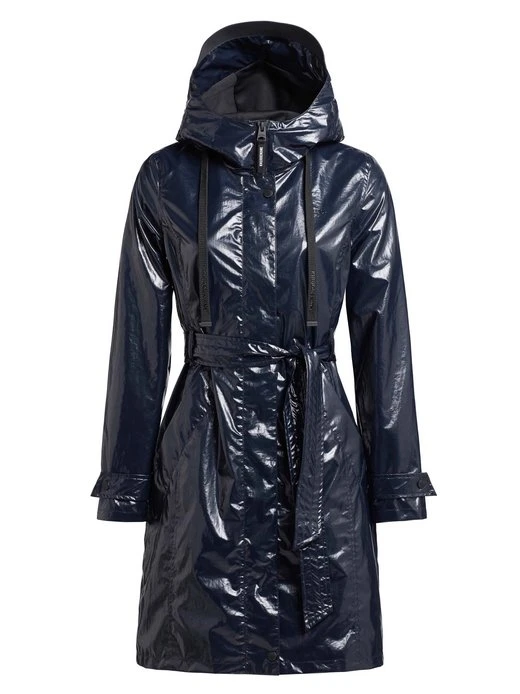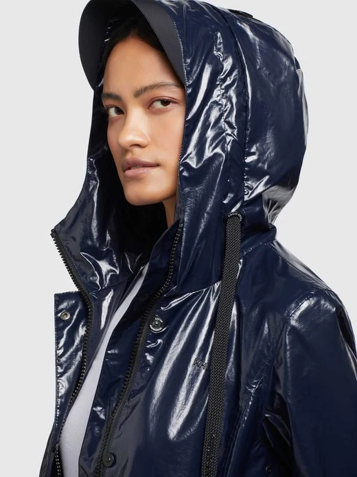 Der glänzende khujo Mantel ALECIA ist eine Mischung aus Trenchcoat und Regenmantel. Dank einem wasserabweisenden Obermaterial, einer Kapuze mit Meshfutter und Kordelzug, Seitenschlitzen mit Druckknöpfen sowie Belüftungsösen unter den Armen und einem Mesheinsatz im Innenfutter bietet der Sommermantel einen angenehmen Tragekomfort. Ein abnehmbarer Stoffgürtel, ein Reißverschluss mit Magnetknopfleiste, Eingrifftaschen und eine Innentasche runden das Desgin bei diesem Kurzmantel gelungen ab.