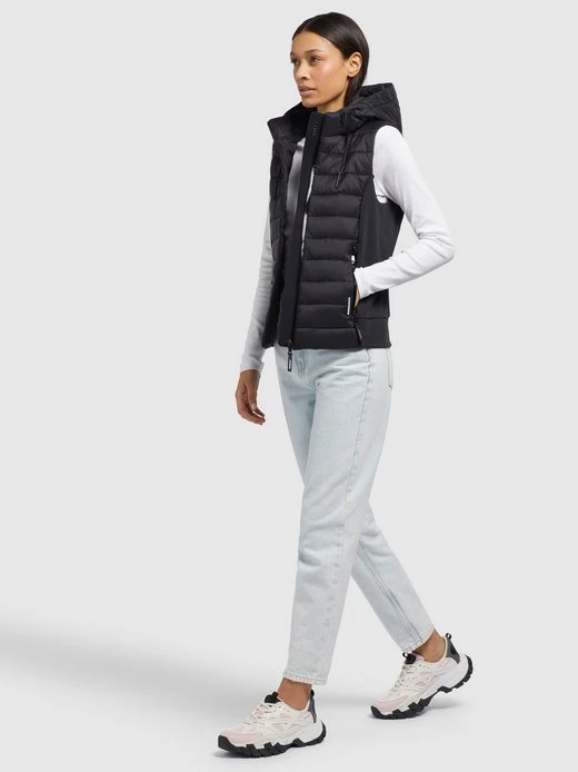 Die hüftlange khujo Weste FABIA MATT mit abnehmbarer Kapuze, einem elastischen Kordelzug und einer leichten Wattierung in der gesteppten Vorderseite, Kapuze und der Passe im Rückenteil lässt sich vielseitig kombinieren. Dank einem Reißverschluss und seitlichen Reißverschlusstaschen mit einer wasserabweisenden Beschichtung, einer Windschutzblende und einem verstärkten Stehkragen bist Du mit dieser Steppweste gut ausgestattet.